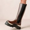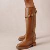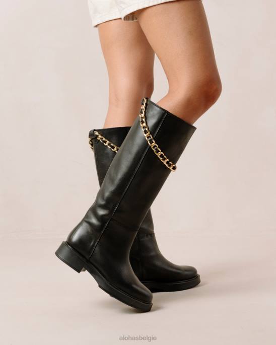 Met neutrale tinten als een herfstseizoen, moet deze zwarte lederen hoge laarzen perfect zijn om aan te glijden met je favoriete trenchcoat. Ze hebben een lage hiel die het been subtiel verlengt en ook worden afgezet met een dikke gouden ketting die zich om het been wikkelt – gewoon een andere manier om een extra dosis bling in je dagelijkse kleding op te nemen. Fabulous!