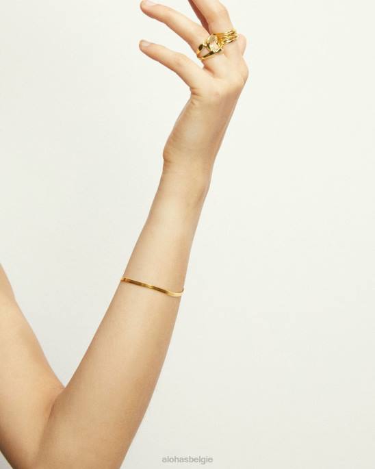 Vet in zijn minimale ontwerp, deze gouden armband maakt het perfecte armsnoepje als hij er chic uitziet, is het doel. Het is gemodelleerd op de klassieke visgraatketen, dus het zit plat om je pols. Een zorgvuldig ontworpen stuk dat nulstylingvaardigheden vereist – neem het op in elke outfit met minimale inspanning, maar maximale impact.
