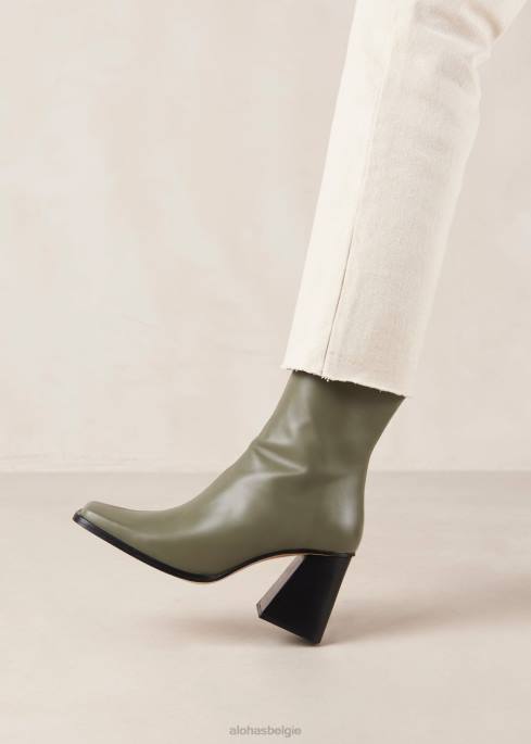 Groene lederen enkellaarzen met blokhiel