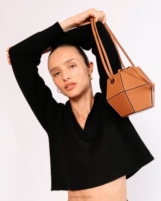 Bruine lederen geometrische bucket -tas met crossbody -band